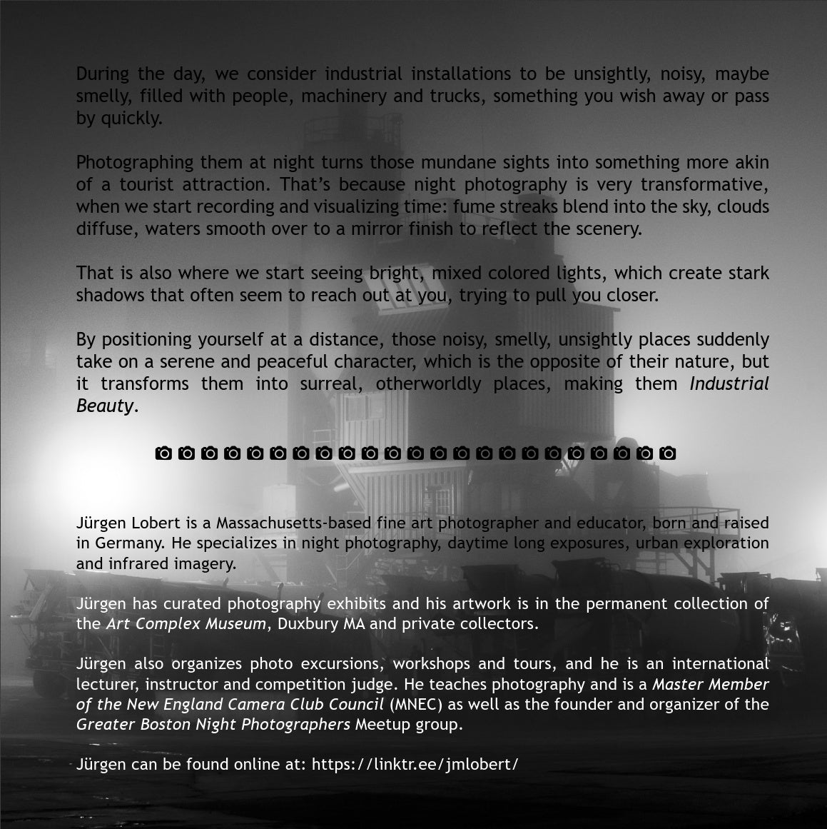 This is a 20 page photo book with glossy covers and high quality satin photo pages, which I produced for my recent exhibit Industrial Beauty - Luminous Desert at the Art Complex Museum. The book is entirely filled with many of my favorite industrial night scenes and also contains some text for inspiration about why I chose that theme.